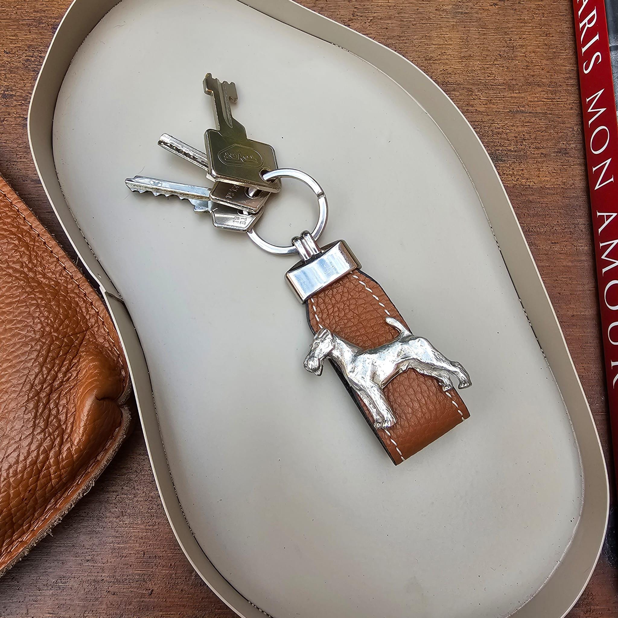 This handcrafted Irish Terrier keychain is an ideal accessory for dog lovers, especially those who cherish the Irish Terrier breed. Meticulously designed and crafted, each keychain is made from high-quality pewter, giving it a sturdy yet elegant look. The keychain is finished with a stunning silver plating, creating a polished and refined appearance that is perfect for any dog owner.